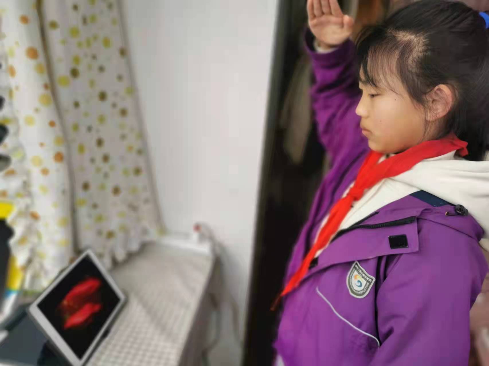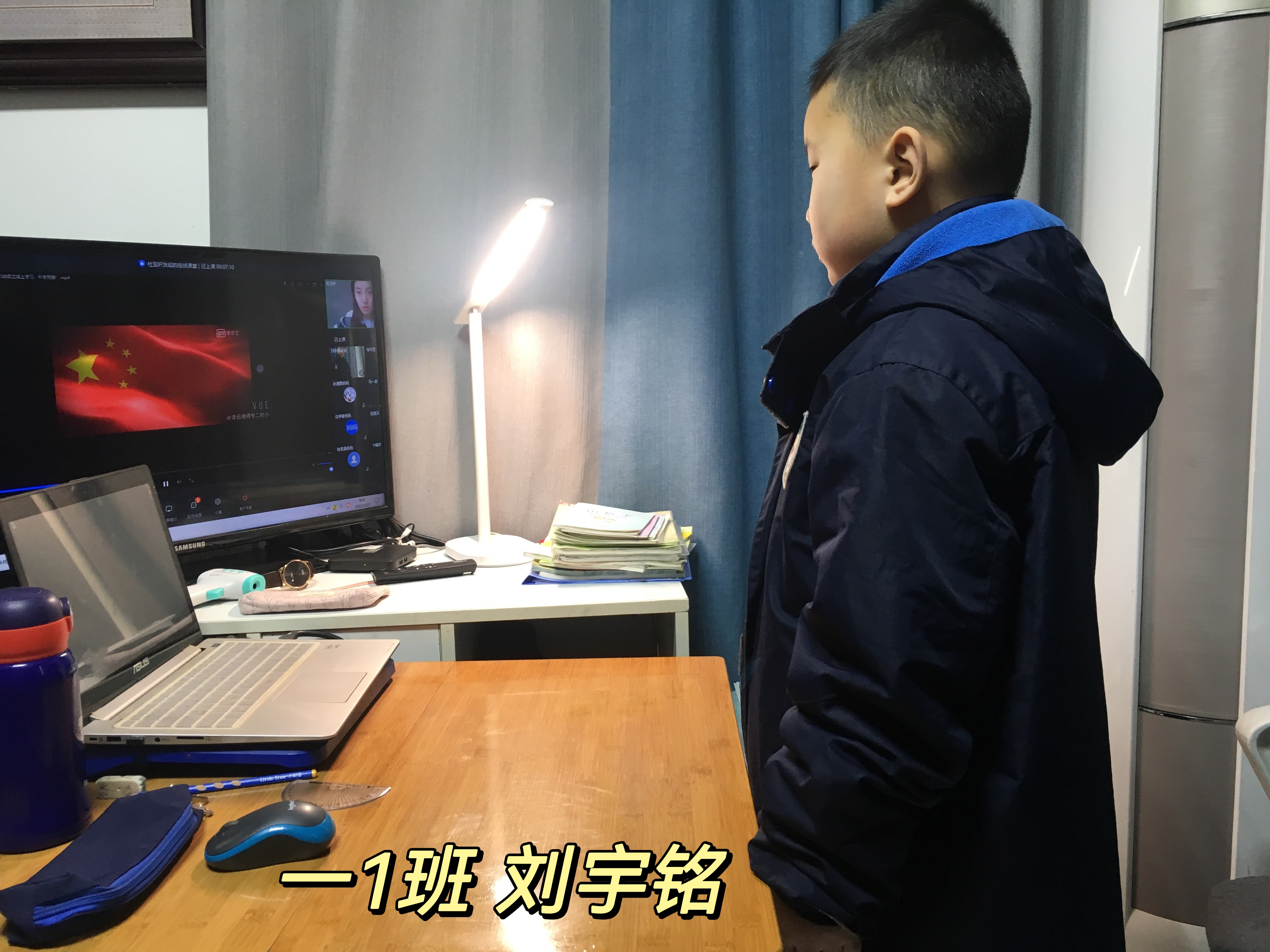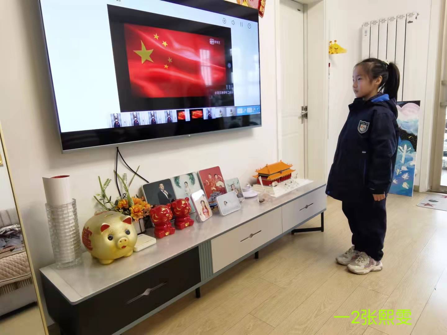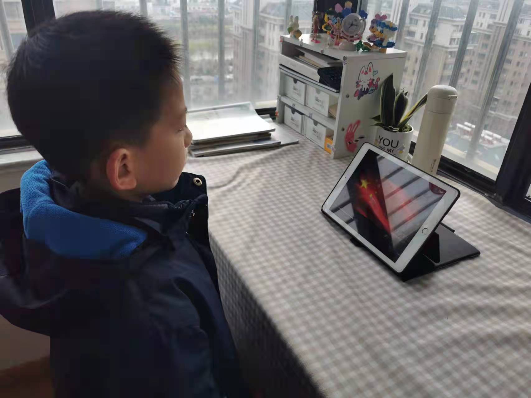 (学生升旗敬礼的照片和线上开展的照片)