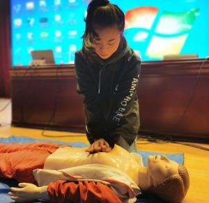 在讲座过程中,孙婷医生带领教师和学生利用假人进行心肺复苏操作演练。