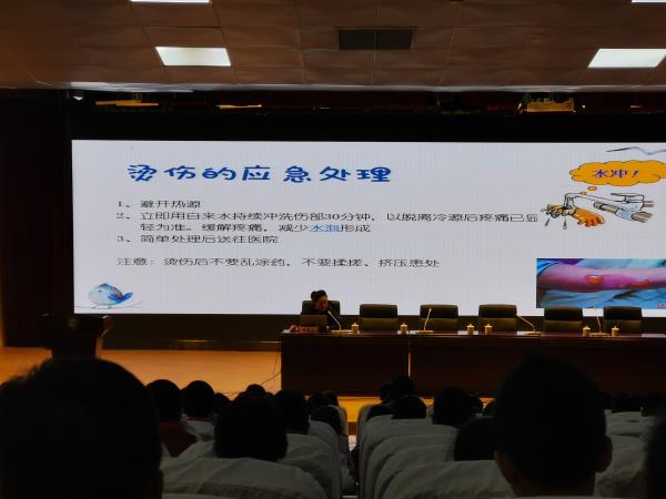 活动中,周燕玲主任采取理论讲解和演示操作相结合的方式,利用PPT和视频,向同学们讲述了溺水救护原则、烫伤的应急处理、扭伤的应急处理、犬咬伤的预防、踩踏自救、被毒蛇咬伤应急处理、电击伤救护原则、气道异物梗阻急救法、腹部冲击自救法、心肺复苏术等生活中常见的急救知识。