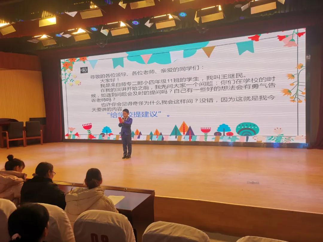 为贯彻落实“立德树人”“五育并举”办学宗旨,培养德智体美劳全面发展的新时代好少年,12月1日,师专二附小开展以“二附少年说——我给附小提建议”的主题演讲活动。四年级部11名学生参加此次活动。
