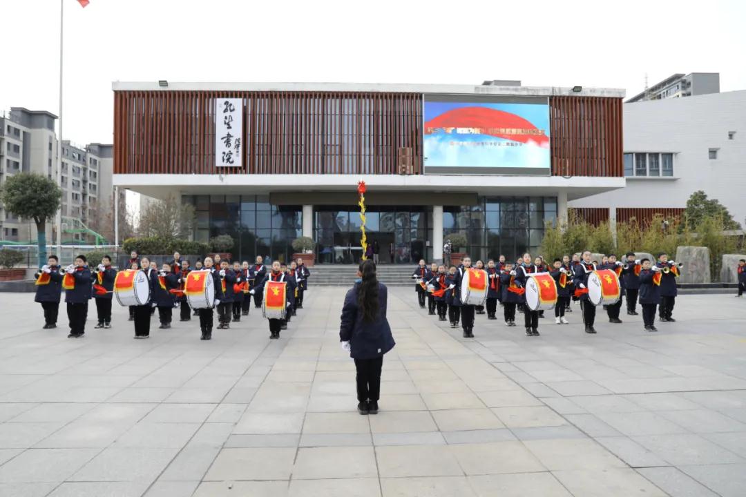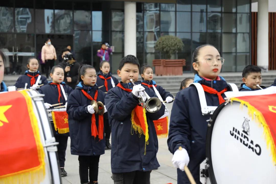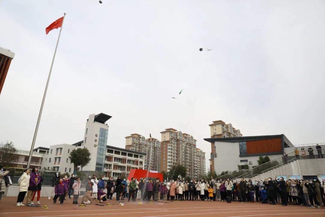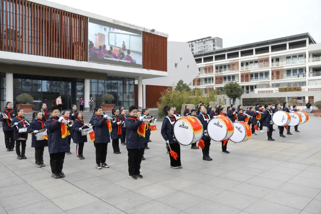 操场上展示了益智科技类社团用塑料瓶、橡胶塞等可回收物品制作而成的水火箭,体现了孩子们的环保意识与创新精神。学校鼓号队的孩子们个个精神抖擞,铿锵的鼓号奏响欢迎的号角。