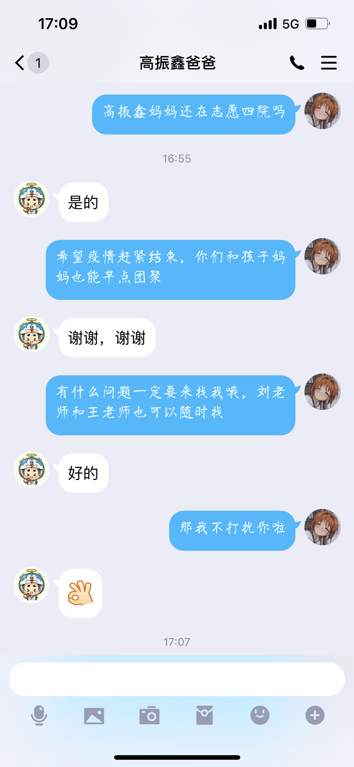 一10班赵浩博妈妈负责核酸检测工作和隔离人员管理工作,爸爸担任海州区疫情隔离点和管控区医疗危废处置情况检查工作。郑瑾老师看出孩子非常思念妈妈,就向赵浩博解释了父母不能陪伴他的原因,鼓励孩子坚强起来,并且每天与赵浩博聊天、谈心。