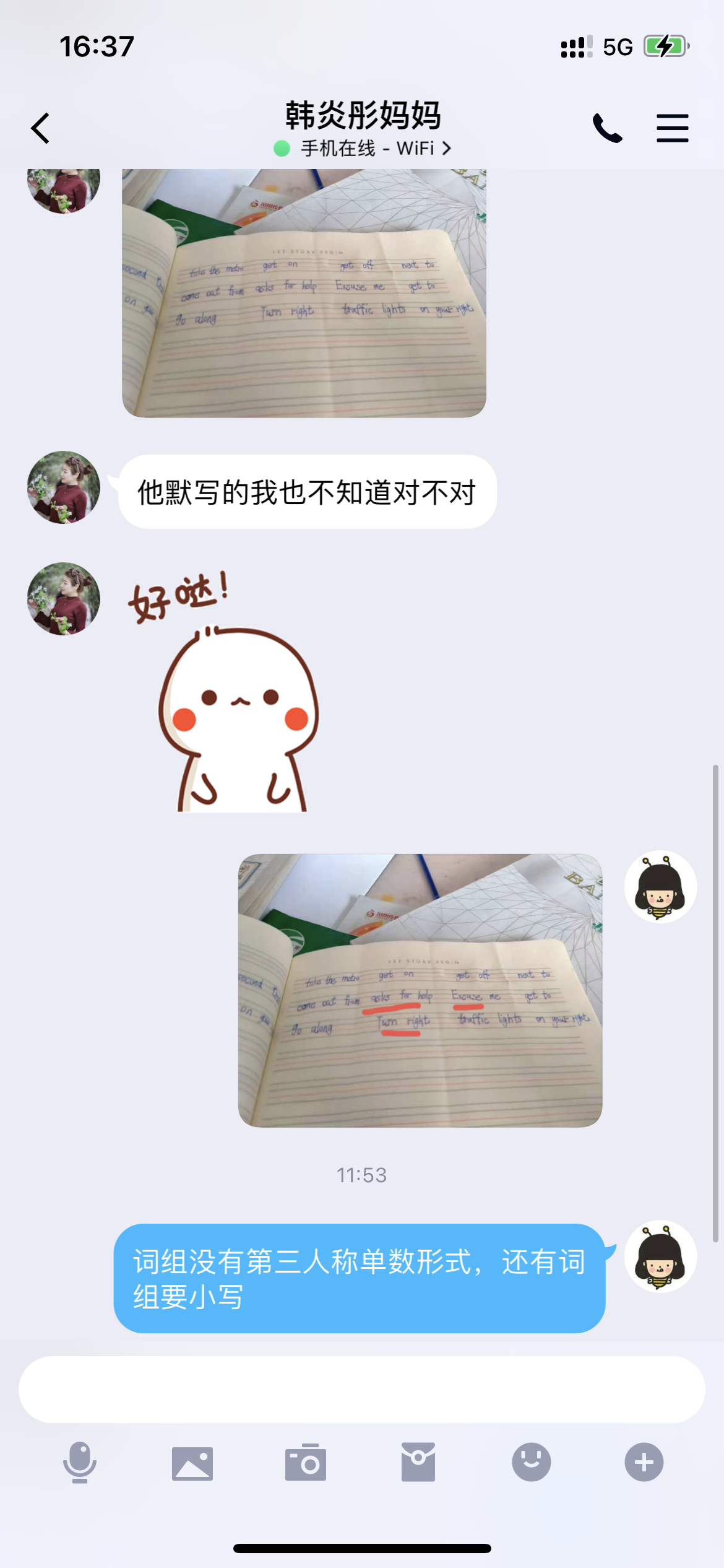 五4班韩炎彤妈妈在中医院中药房,负责备药煎药工作。沈竹影老师平时借助QQ文字聊天等方式帮助孩子解答一些作业上的疑问,进行知识点讲解,与孩子闲聊安抚妈妈不在身边的情绪。