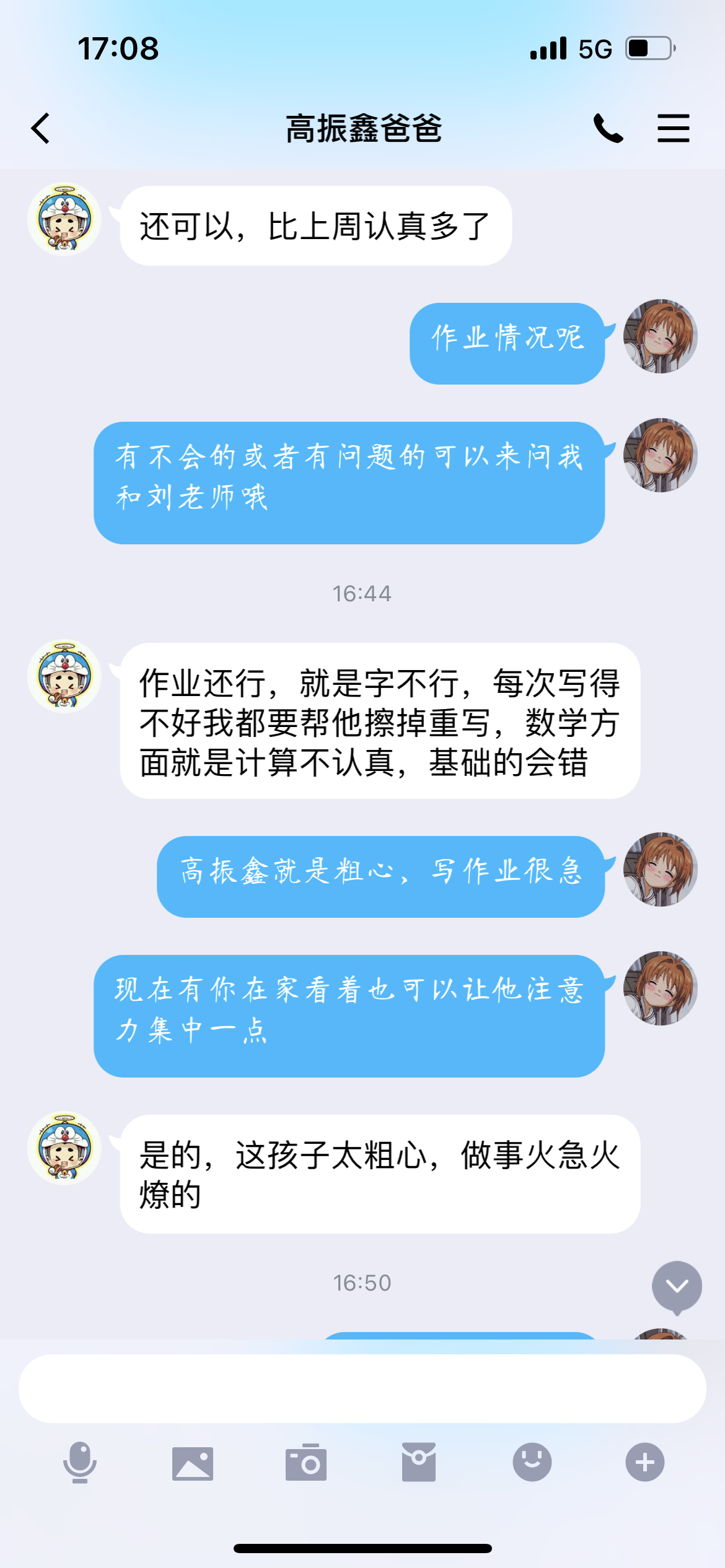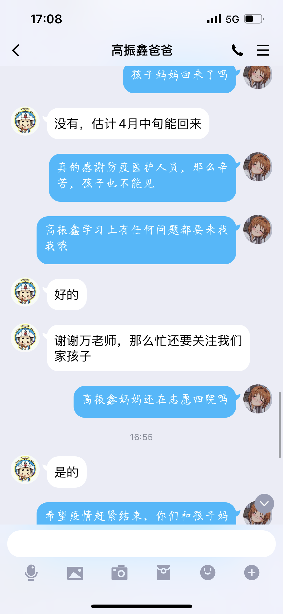 三1班晁舶瀚的妈妈在锦屏山卫生院工作,疫情期间负责采样或后勤,孙振洁老师经常通过QQ、微信等方式关心孩子。