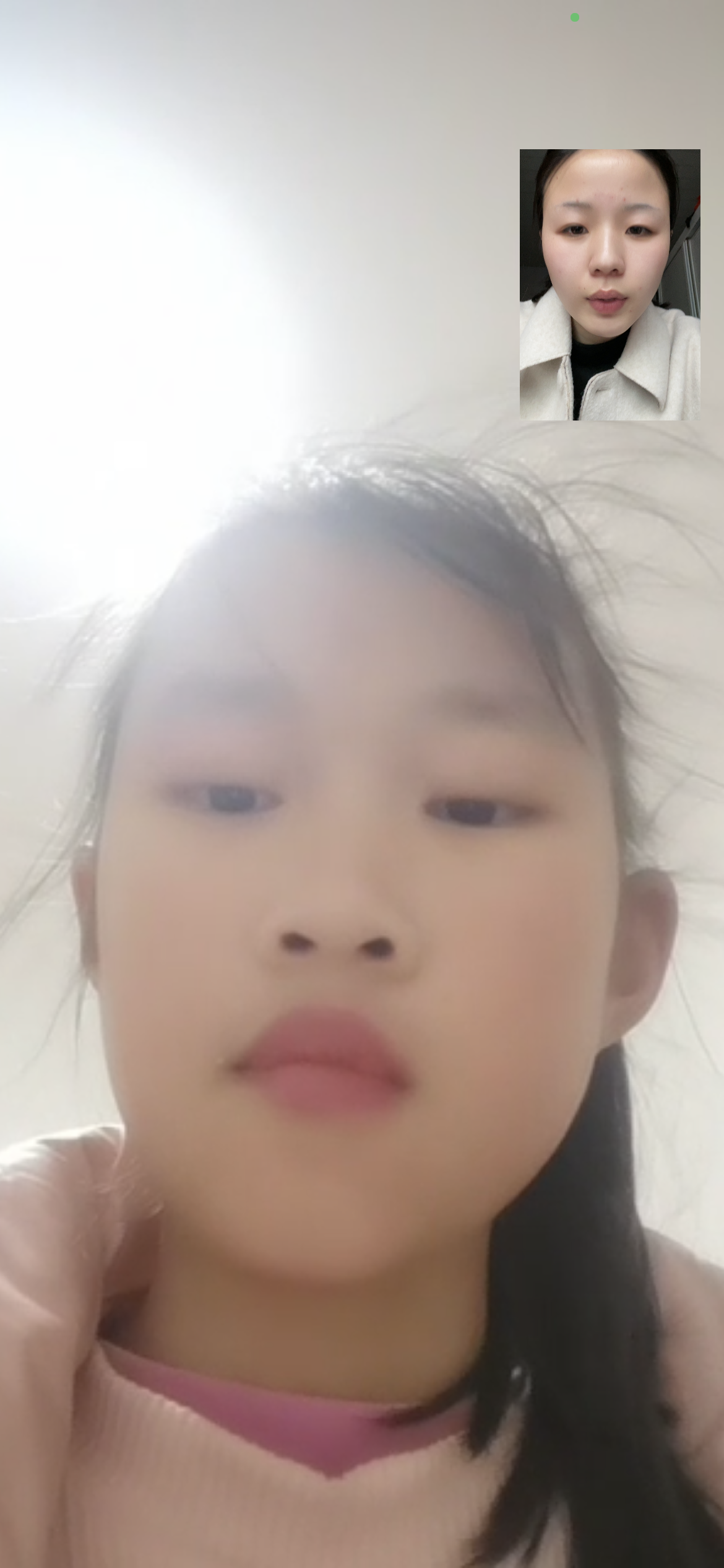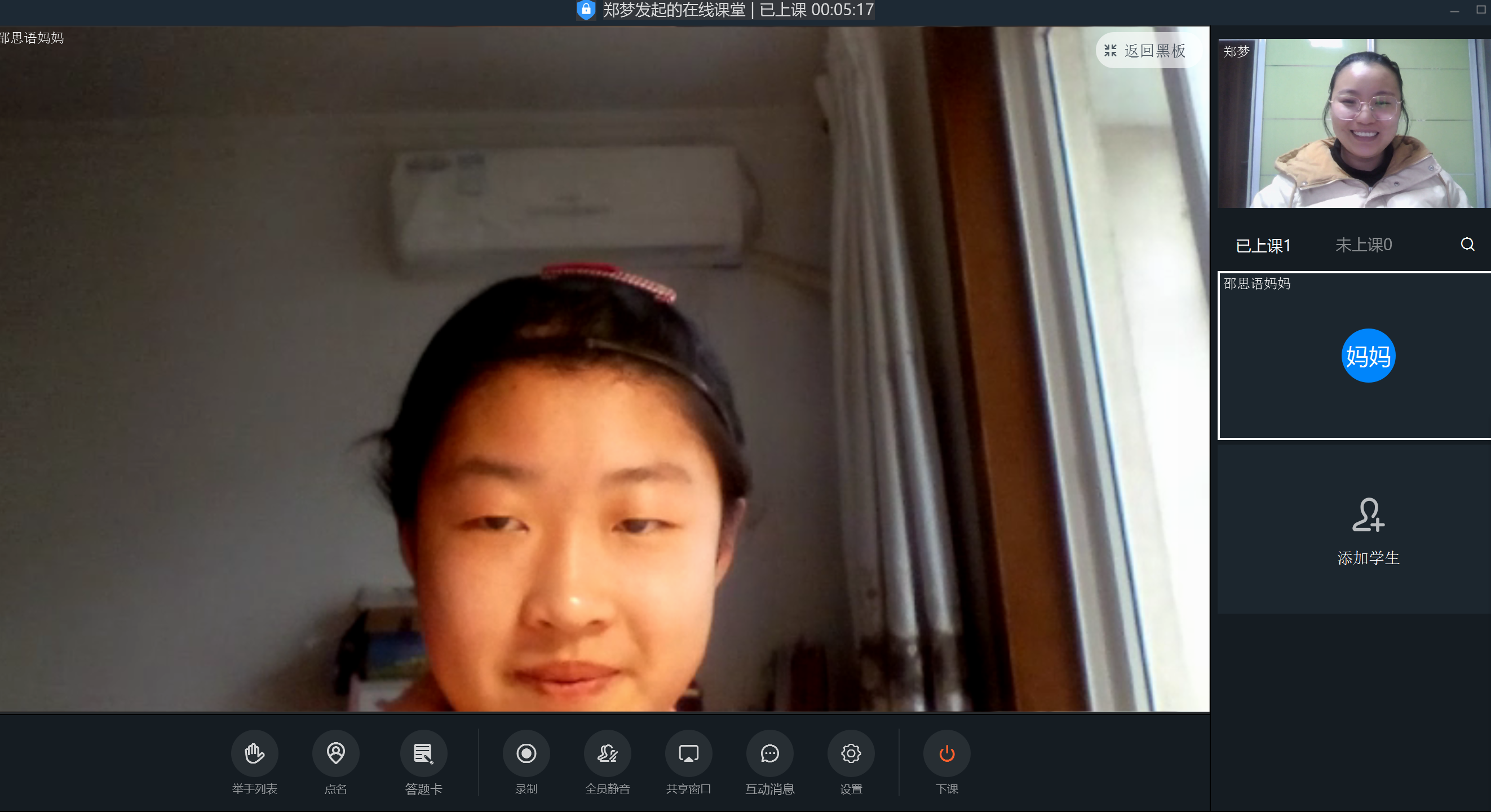 五4班张文静妈妈在医院负责样本送检及抢救病人等工作。沈竹影老师通过QQ视频等方式了解孩子的学习状况,询问其线上教学中存在的困难和困惑,督促学习和完成作业。