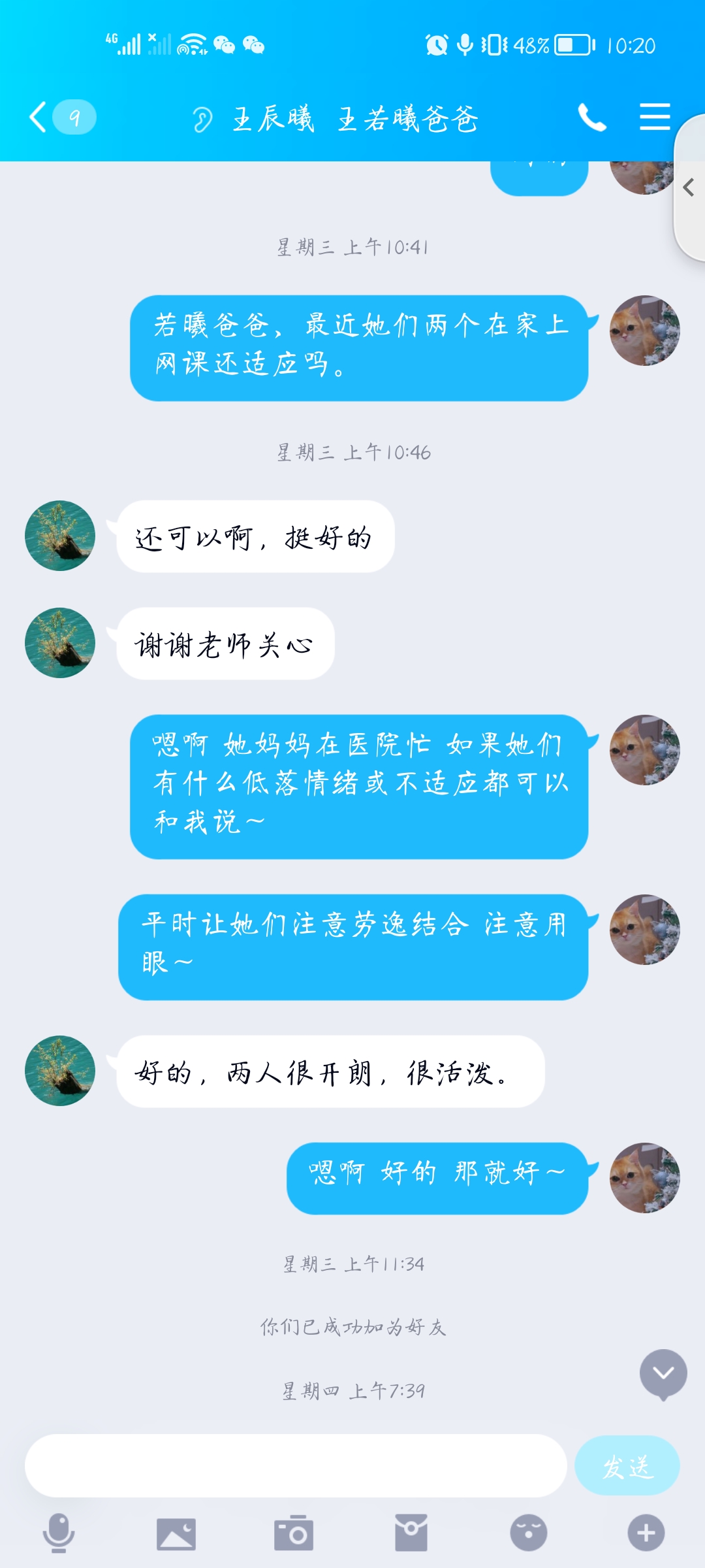 四(11)班王辰曦、王若曦的妈妈是连云港市急救中心的一名医生,自从疫情以来,辰曦、若曦妈妈一直留在医院抗疫,家里两个孩子学习的重任就落在了爸爸一个人的身上。吴迪老师得知情况后,第一时间与家长联系,询问孩子居家学习的状态,疏导孩子心情。孩子们在老师的关怀下心情逐渐好转,也承诺会好好学习等待与妈妈的相见。