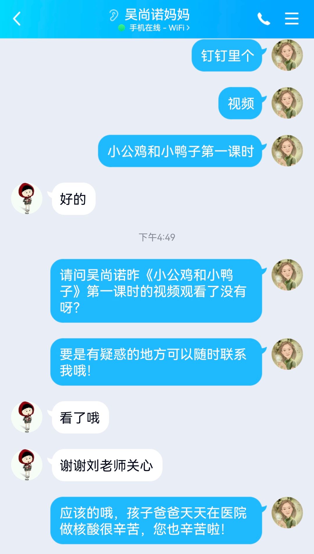 四3班单启涵妈妈在海州人民医院负责实验室核酸样本接收及每日报表工作。程敏慧老师经常通过视频连线的方式关心孩子居家学习生活。