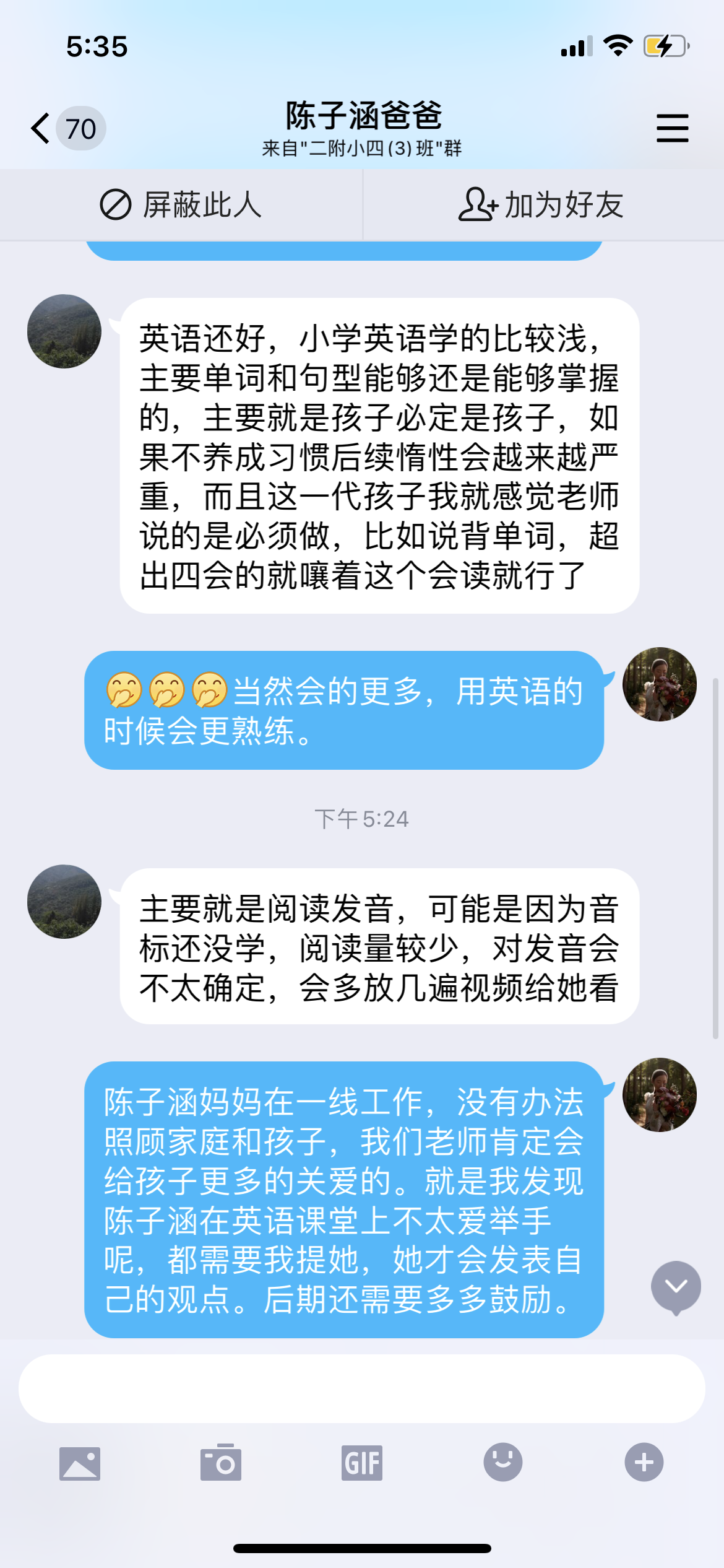 四(3)陈子涵妈妈在新坝卫生院工作,疫情期间负责新东街道黄码红码采样工作。班主任在课上会特别关注陈子涵,在课后及时与孩子的爸爸沟通反馈。