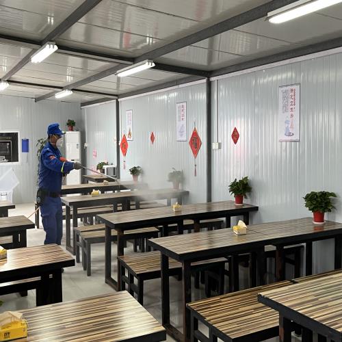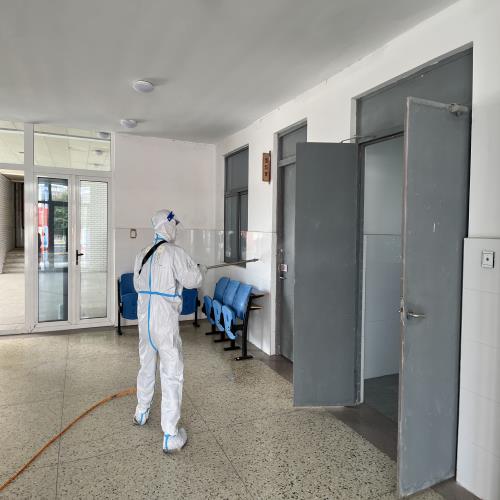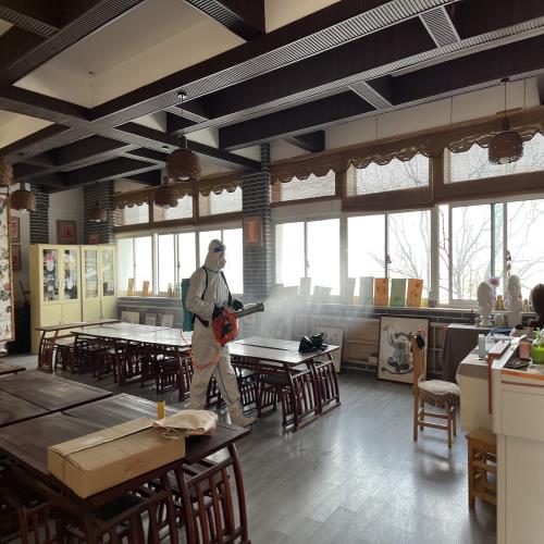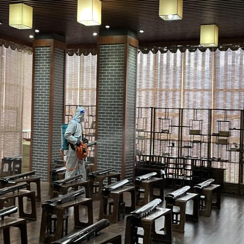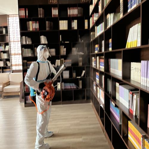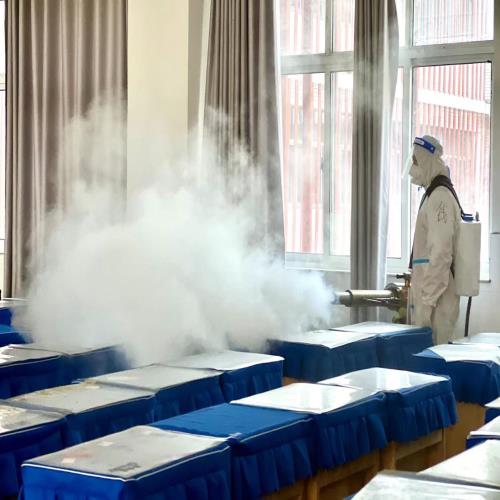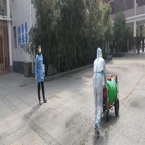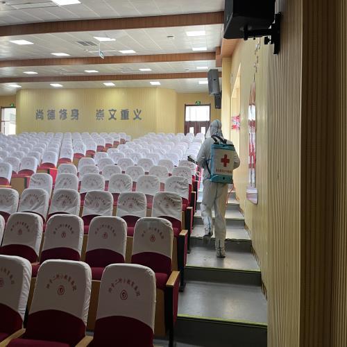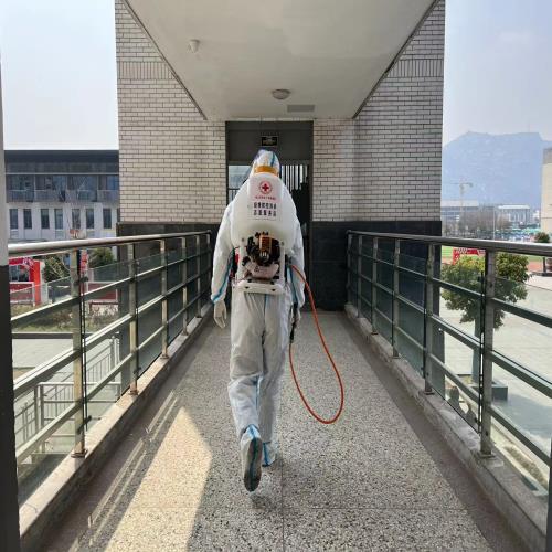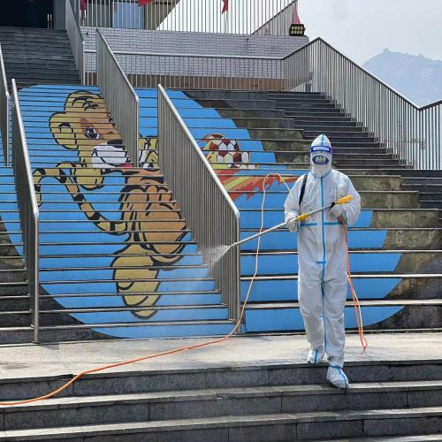 蓝天救援队的青年志愿者身着防护服,背扛喷雾消毒机,在后勤保障处工作人员的协同配合下,分为四组对我校各个角落进行多角度、全方位消毒,做到横到边,纵到底,不给病毒任何的存活空间。