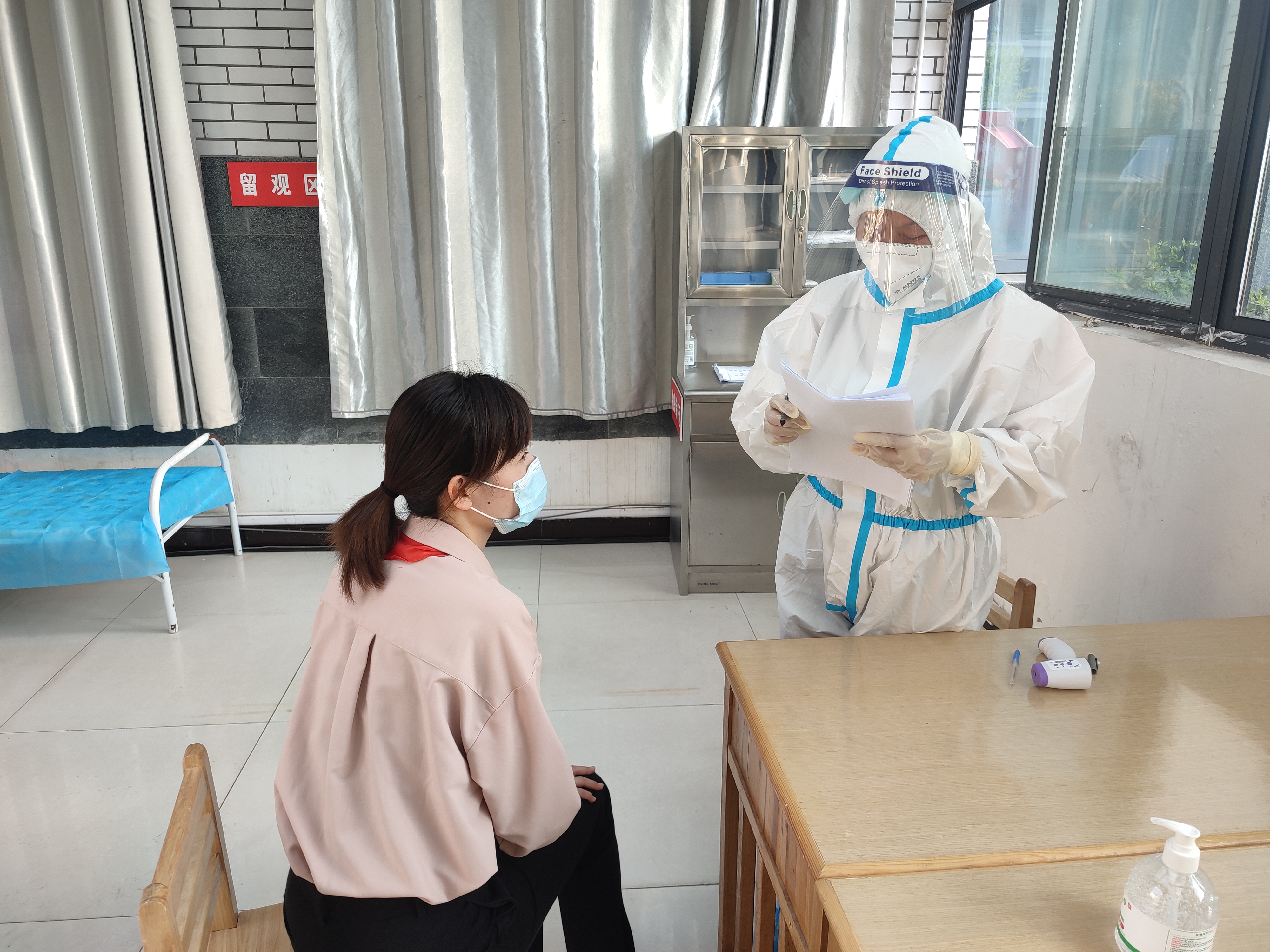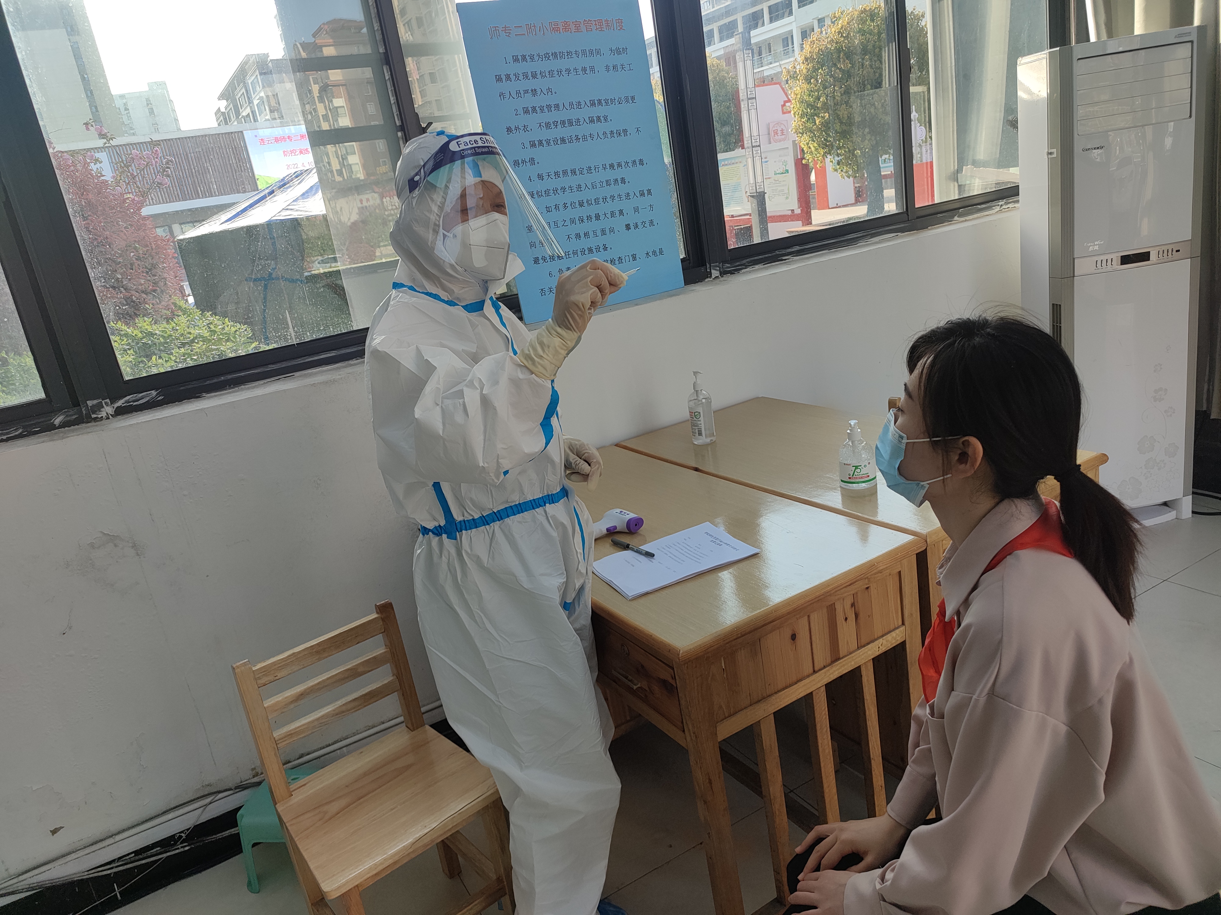 上课期间,发现体温异常并伴随呕吐的学生,校领导接到该班老师报告后立即启动疫情防控应急预案,对疑似学生进行应急处理,值班校长现场指挥调度,学生处负责疫情汇报,班主任带领班级内其余学生转移到应急疏散地进行分散就坐。