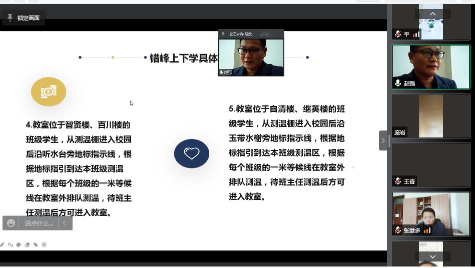 副校长孟庆甲从全体师生复学前的材料收集、复学后的校园防控管理、学生及家长的健康监测、应急情况的处置流程等方面提出了总体要求,他指出要在学校“两案九制”的基础上落实“师生一人一档”,确保信息采集的准确性,要求所有师生信息不瞒报、不漏报,全面筑牢校园疫情防控安全网。接着,学生处主任赵强详细介绍了学生复学需要的相关手续和材料,规范学生每日进出校的时间和路线,全面制定疫情突发状况防控的应对方案。周孟芝老师对正副班主任复学后的每日工作做了具体要求,强调了学生晨午检和上下学的原则,落实班级网格化管理。