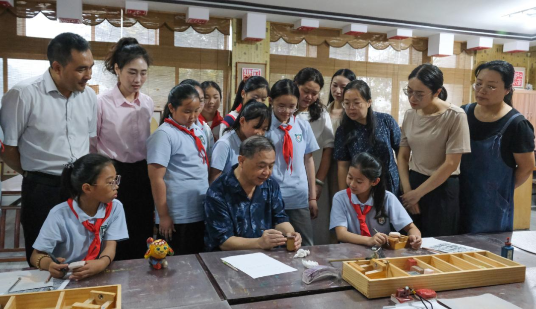 随后,张局长一行参观了学校“与海共生”美术展和特色社团教室,曾翔老师亲自为“石室陶瓷印学社”的师生指导篆刻技艺并题词。张局长对学校优美的育人环境、浓厚的文化氛围以及师生们积极向上的精神风貌给予了充分肯定,同时指出美育是学生全面发展的重要组成部分,希望学校继续深化美育教育改革,进一步挖掘美术教育的内涵,努力打造特色鲜明、成效显著的美育品牌,为学生的全面发展和终身发展奠定坚实的基础。