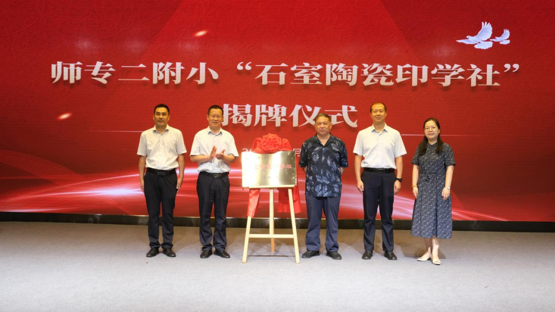 为弘扬中华优秀文化,提高学校美育水平,提升学生艺术素养,9月11日上午,师专二附小“石室陶瓷印学社”揭牌仪式在童心剧场举行,市教育局副局长张团思、市教育局体卫艺处处长孙学明、中国国家画院研究员曾翔、校党总支书记胡芸、校长杨金斌等出席揭牌仪式。