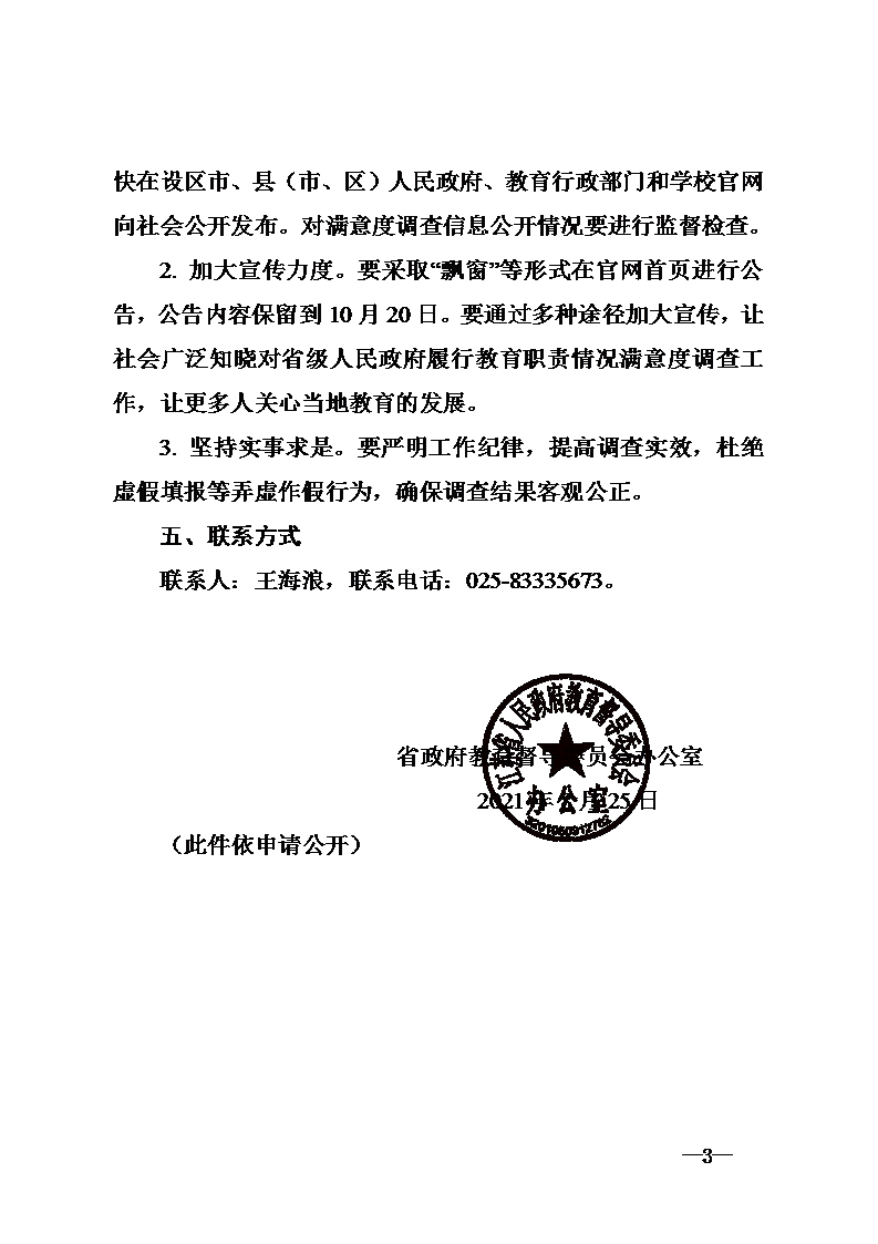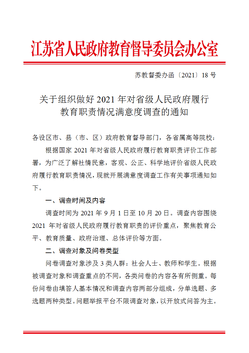 关于组织做好对2021年省政府履行教育职责情况满意度调查的通知(苏教督委办函(2021)18号)
